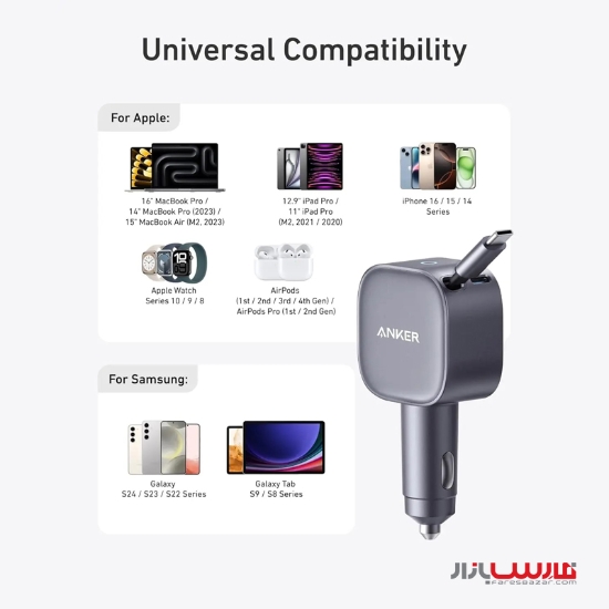 - میزان توان45 وات سیم جمع شونده ، 30 وات پورت USB-C مجموع 75 وات